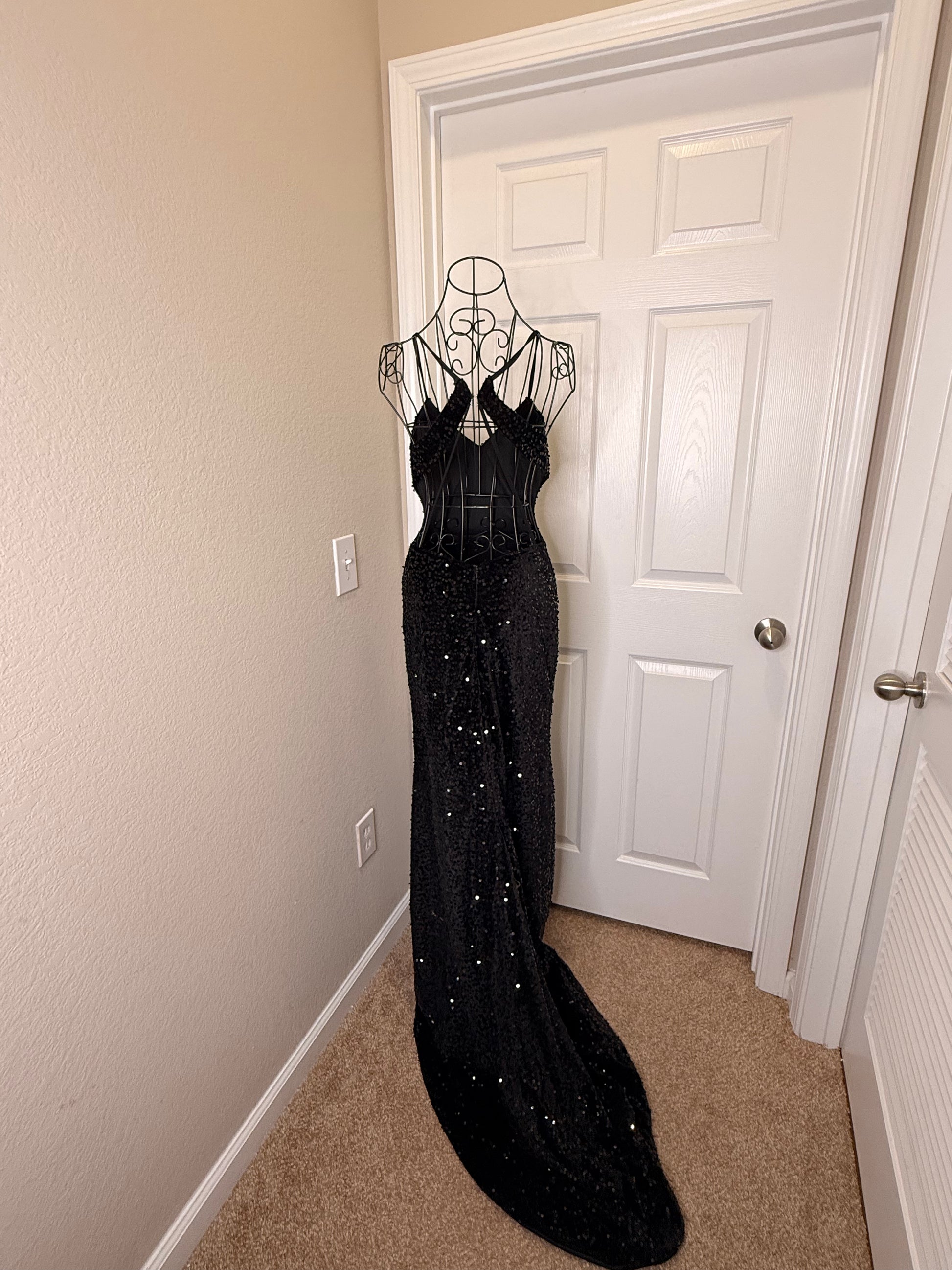 Black sequin gown with strappy back, slit and train. Pre loved