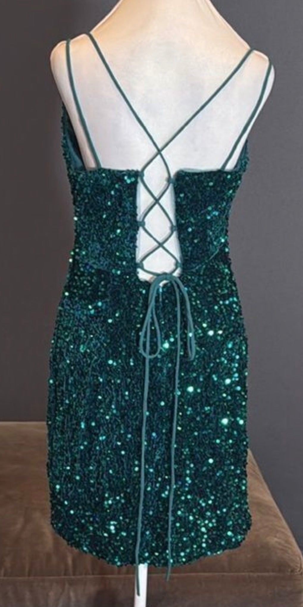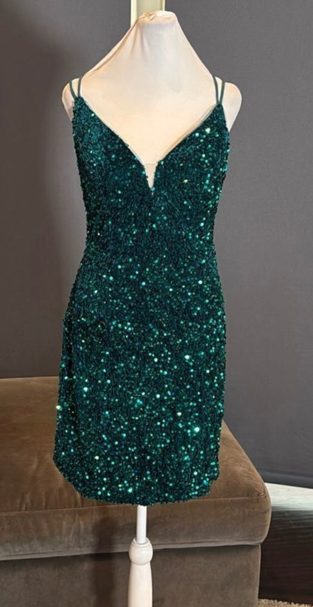 Beautiful green sequin cocktail dress with criss cross back.